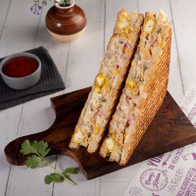 Grilled sandwich with eggless mayonnaise, handmade tandoori spread, tandoori paneer [cottage cheese], fresh veggies and mild spices.